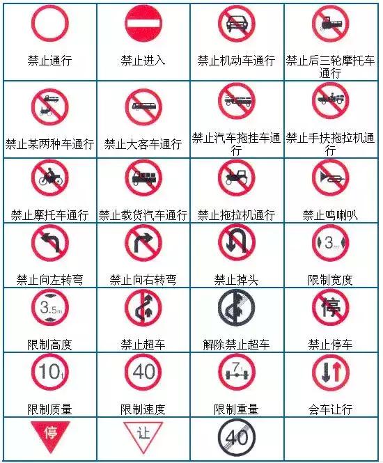 ③ 禁令標(biāo)志:通常為圓形,白底紅邊,紅斜杠黑色圖案。是根據(jù)街道、公路和交通量情況對車輛加以禁止或適當(dāng)限制的標(biāo)志。如禁止通行、禁止停車、限制速度、限制重量、限制寬度等。