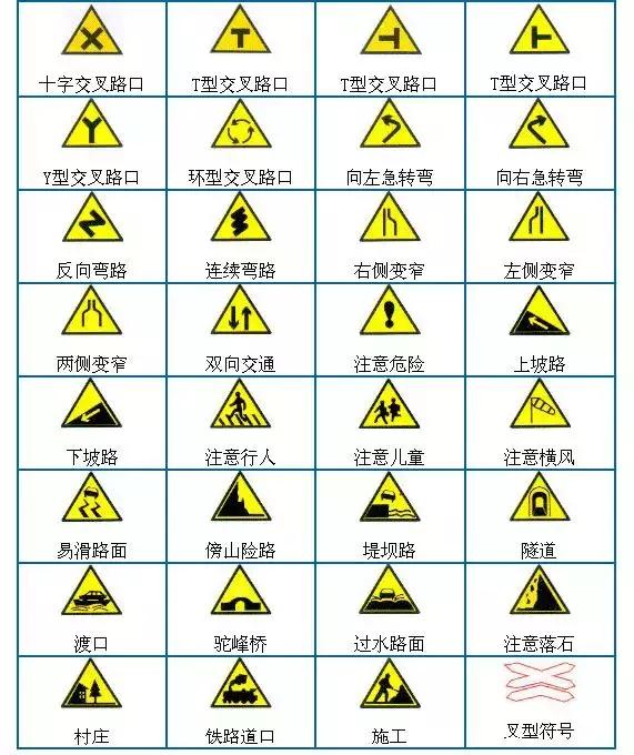 ② 警告標(biāo)志:通常為等邊三角形(或菱形),黃(白)底黑(紅)邊,黑色(或深藍色)圖案。用于警告駕駛?cè)藛T注意前方路段存在的危險和必須采取的措施。如預(yù)告交叉口、道路轉(zhuǎn)彎、鐵路道口、易滑路段、可能落石路段、不平路面、合流交通等。
